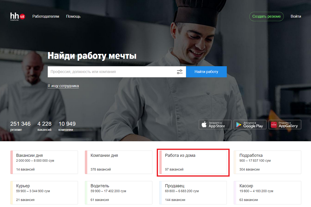 구인구직 사이트의 hh.uz의 재택근무 구인광고