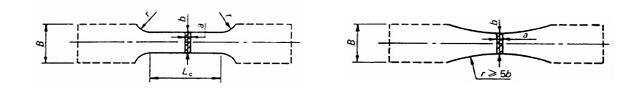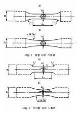 - 시험부와 물림부 양끝 사이에 접선이 연속적으로 변하는 어깨부이거나(그림 4) 또는 양끝 사이에 연속적인 반지름을 가지면서(그림 5) 시험 부위에 걸쳐 두께가 균일한 사각형 단면 시험편