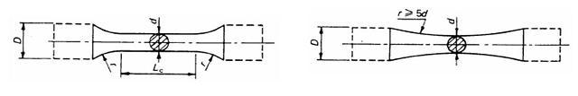 - 시험부와 양끝 사이에 걸쳐 접선이 연속적으로 변하는 어깨부이거나(그림 2) 또는 양끝 사이에 연속적인 반지름을 가진(그림 3) 원형단면 시험편