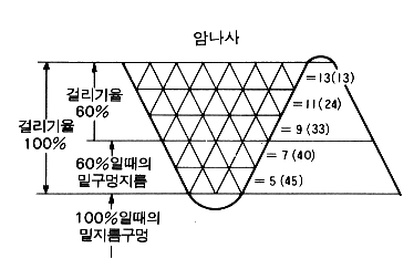 상기 그림에서와 같이 암나사산의 단면적을 작은 삼각형(45개)으로 분할했다. 만일 걸림률을 60%로 가정한다면, 암나사의 나사산의 면적은 33개의 작은 삼각형이므로73.3%(33/45x100)가 된다. 걸림률을 80%로 가정하면 암나사의 나사산의 면적은 40개의 작은 삼각형이므로 89%(40/45x100)가 된다 상기 결과를 보면, 걸림률이 작아지는 것에 비하면 단면적의 줄어듬은 작은 편임을 알 수 있다. 암나사의 경우 내경에 해당하는 구멍을 드릴작업을 통해 가공한 다음 탭으로서 나사산 부위를 만들게 된다. 이렇게 내경에 해당하는 구멍을 밑구멍이라고 하며 밑구멍의 지름값을 결정하는 것이 물림률을 결정하게 되는 것이다. |