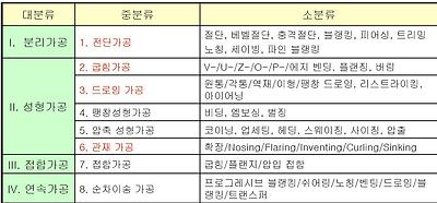 - 박판 금속을 소재로 하여 이어 붙임 없이 소성변형에 의하여 필요한 형상으로 성형 하는 가공 방법