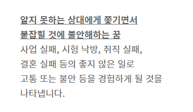 그리고 이 일을 기숙사에서 룸메들한테 풀었는데 제 룸메들 중 꿈 해몽을 재밌어하는 룸메가 네x버에 찾아보더니 누군가한테 쫓기는 꿈은 하는 일마다 실패하게 된다고 알려줬습니다. 제가 귀신한테 성적 잘 나오게 해달라고 해서 벌받은 걸까요? 룸메가 보여준 꿈해몽입니다! 카톡으로 보내준 거 찾아왔어요.