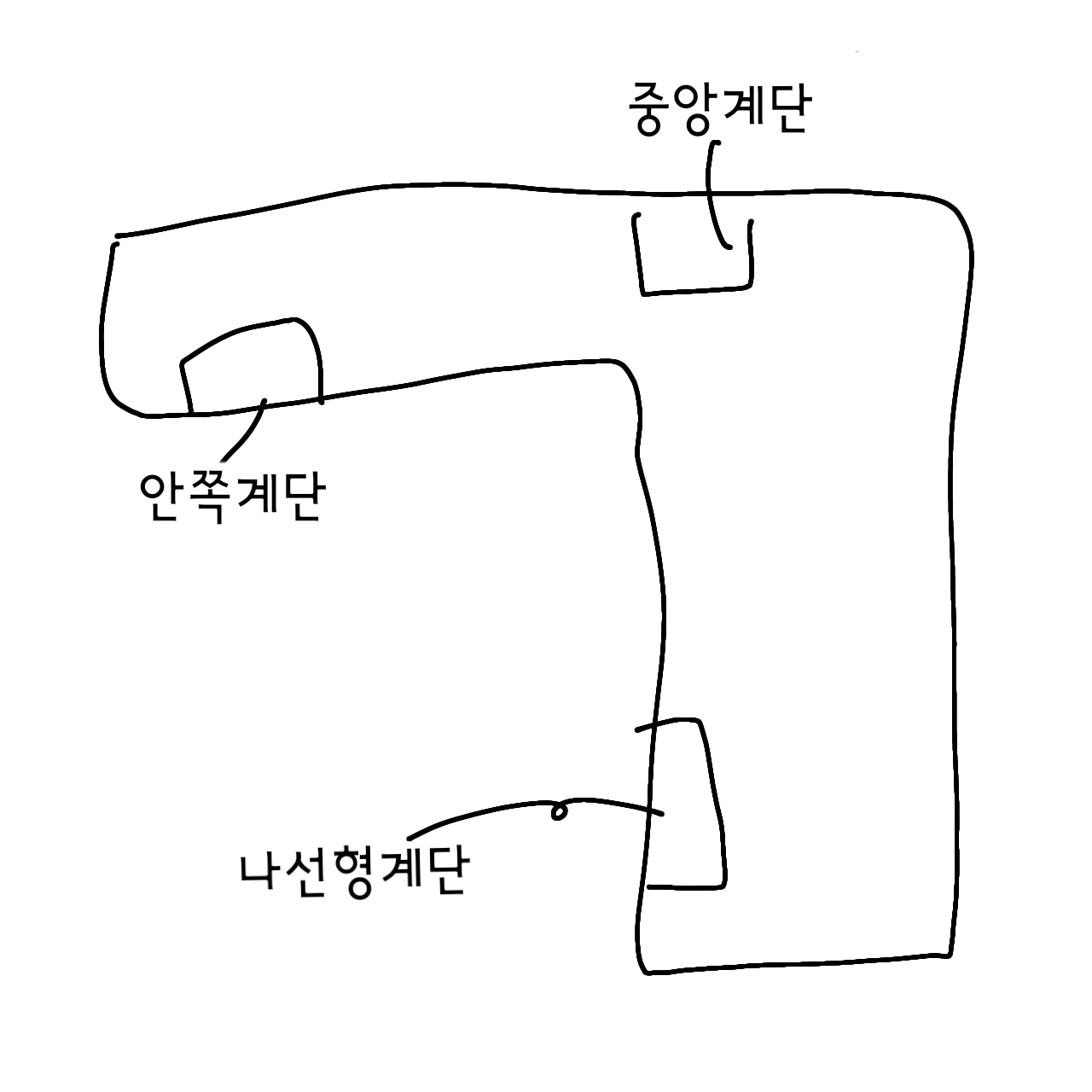 루트는 4층 나선형 계단으로 올라가서 안쪽계단으로 5층에 올라갔다가 다시 나선형계단을 통해 반이 있는 4층으로 내려오는 구조였습니다.