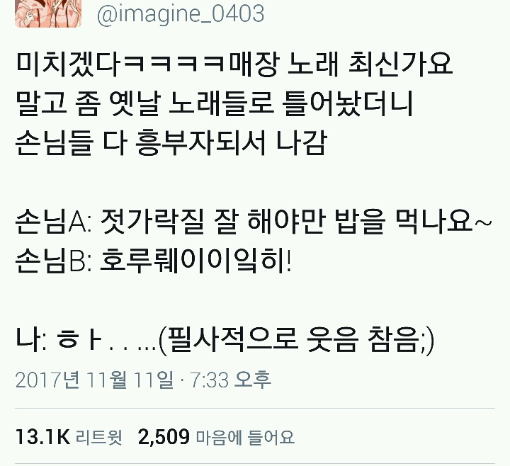아 오랜만에 트윗갔다가 빵터졌어욬ㅋㅋㅋㄲ 작성자삿포로에 갈까요,|작성시간17.11.13|조회수590 목록 댓글 2 글자크기 작게가 글자크기 크게가 아낚ㅋㅋㅋㅋㅋㅋㅋㅋㅋㅋㅋㄱ근데 저였어도 호루익ㅇ키!!!할거같아욬ㅋㅋㅋㅋ 다음검색 현재 게시글 추가 기능 열기 북마크 공유하기 신고 센터로 신고 댓글 댓글 2 댓글쓰기 답글쓰기 댓글 리스트 작성자어림없는뽈 | 작성시간 17.11.13 ㅋㅋㅋㅋㅋㅋㅋㅋㅋ아앀ㅋㅋㅋㅋㅋ 작성자김생민 | 작성시간 17.11.13 ㅋㅋㅋㅋㅋㅋㅋㅋ근데진짜옛날노래틀어놓으면자동으로흥얼거려욬ㅋㅋ 댓글 전체보기