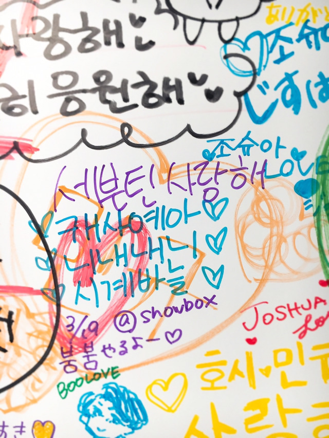 그리고 한쪽 벽에 팬들 메시지 적는 곳이 있는데 꽉차서 막 비집고 들어가서 우리 서당 도련님들 사자성어 쓰고 왔습니다ㅎㅎㅎㅎㅎ