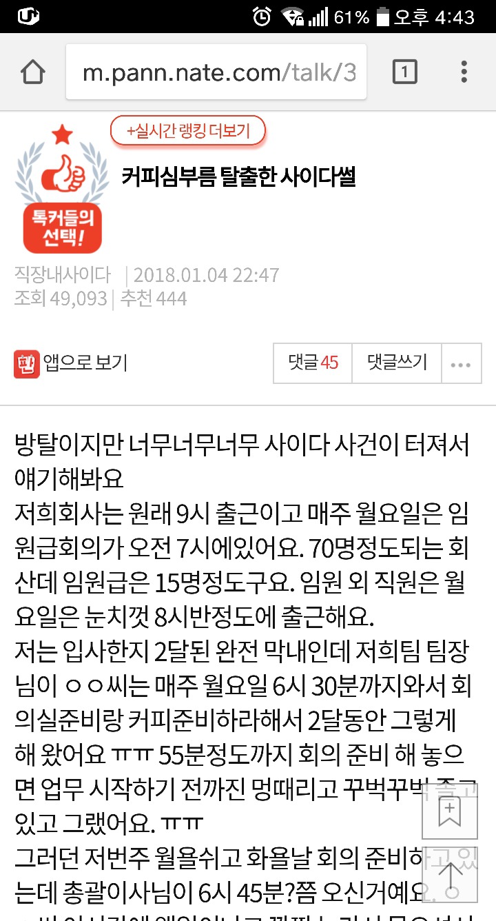 며칠 안되긴 했지만 그 이후로 팀장님도 커피심부름은 일절 안시키세요 ㅎㅎ 다른 심부름은 계속 시키지만..하하하;;