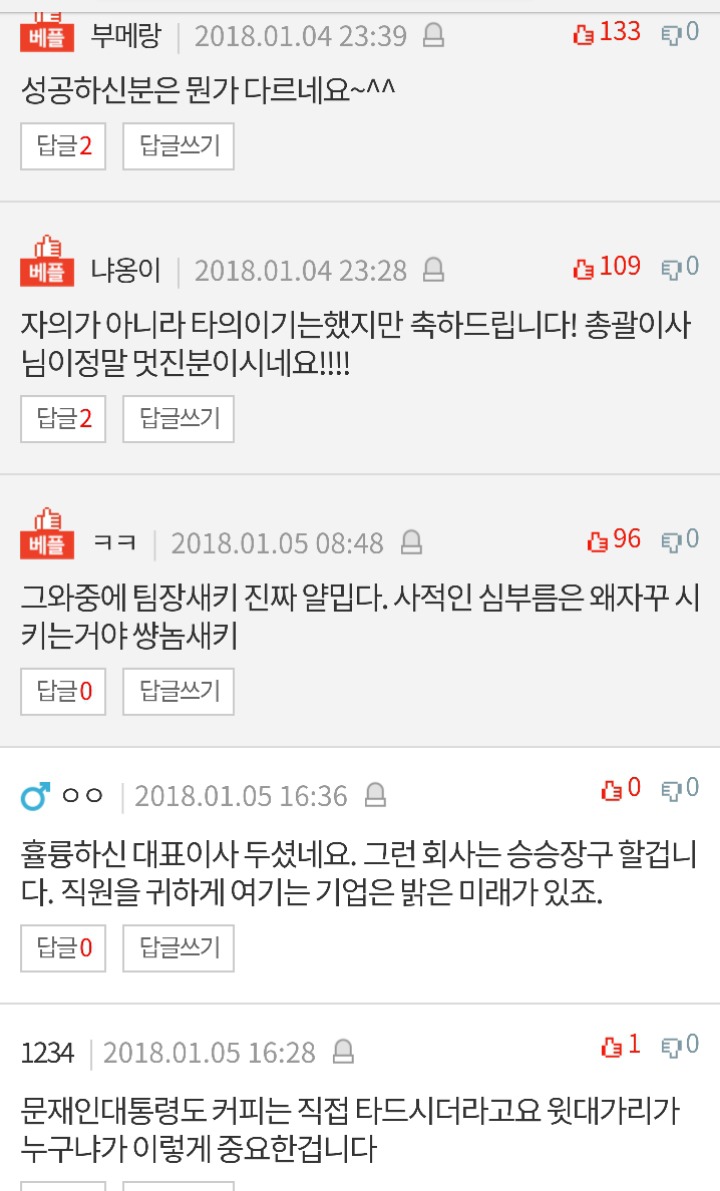 그러던 저번주 월욜쉬고 화욜날 회의 준비하고 있는데 총괄이사님이 6시 45분?쯤 오신거예요. ㅇㅇ씨 이시간에 왠일이냐고 깜짝 놀라서 물으셔서 회의준비하러 나왔다고 얘기했어요. 그랬더니 준비 뭐뭐 하냐고 물으셔서 금요일 오후에 임원들한테 회의자료 취합해서 프린트해서 명수대로 준비하고 자리정리랑 커피탄다고 얘기했어요. 그리고? 하셔서 그리고.. 음.. 쉬어요 ^^;; 했더니 흠흠.. 하는 표정으로 그냥 가셨어요. 그리고 이번주 화요일 임원급 회의때 이사님이 또 일찍 오시더니 오늘은 커피 10분 늦게 달라고 하셔서 7시 10분쯤 임원들 다 모여계실 때 커피들고 들어갔어요. 너무 많아서 7잔정도만 먼저. 들어가서 커피 나눠 드리고있으니 이사님께서 커피 한모금 드시더니 ㅇㅇ씨가 탄 커피 너무 맛 없다고 하시는거예요 ㅠㅠ 순간 얼굴 시빨개져서 우물쭈물 하고 있는데 앞으로 커피는 각자 입맛에 맞게 타먹자고 하시는거예요!!!! ㅇㅇ씨가 탄 커피 너무 맛 없어서 임원들 다 먹지도 않고 대부분 버리는것같다고 하시면서요!! 그리고 회의 자료는 임원들 순번 정해서 돌아가면서 하자고 하셨어요 ㅎㅎㅎ 임원들 다 있는 자리에서 총괄 이사님이 그렇게 말씀 하시니까 다들 아무말 못하고 있더라구요 ㅎㅎㅎ 그리고 순번은 저희 팀장님 지목하시면서 "ㅇㅇ팀장님이 정리해서 알려주세요 (저를보시며) 오늘것 까지는 성의를 봐서 먹을게요 커피타는 재주가 없는거보니 앞으로 커피타는일은 못하겠네요 그만 가보세요" 하시는데 진짜 카리스마랑 멋짐폭발!!!!!! 공식적인 자리에서 그렇게 말씀 하셨기때문에 저는 담주부턴 회의준비를 공식적으로 안해도 되게 되었어요!!!ㅎㅎㅎㅎ