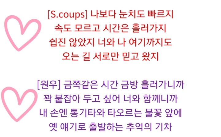 작성자두줄세줄 작성시간 18.03.05 정말 보기 좋아요 원우 가사 특히 좋아하는데 저렇게 진짜 잠깐잠깐 읊조리는게 바로 가사가 되다니 멋져요ㅠㅠㅠㅠ