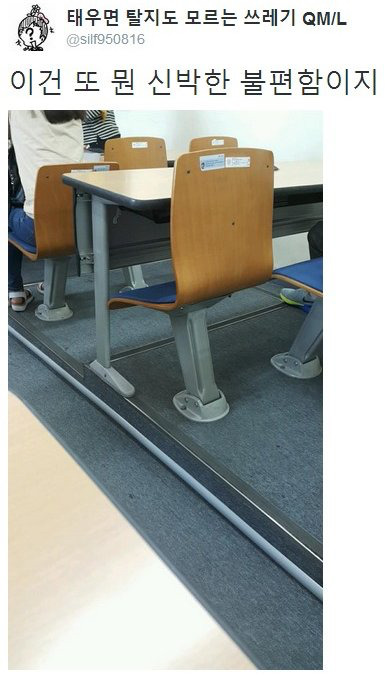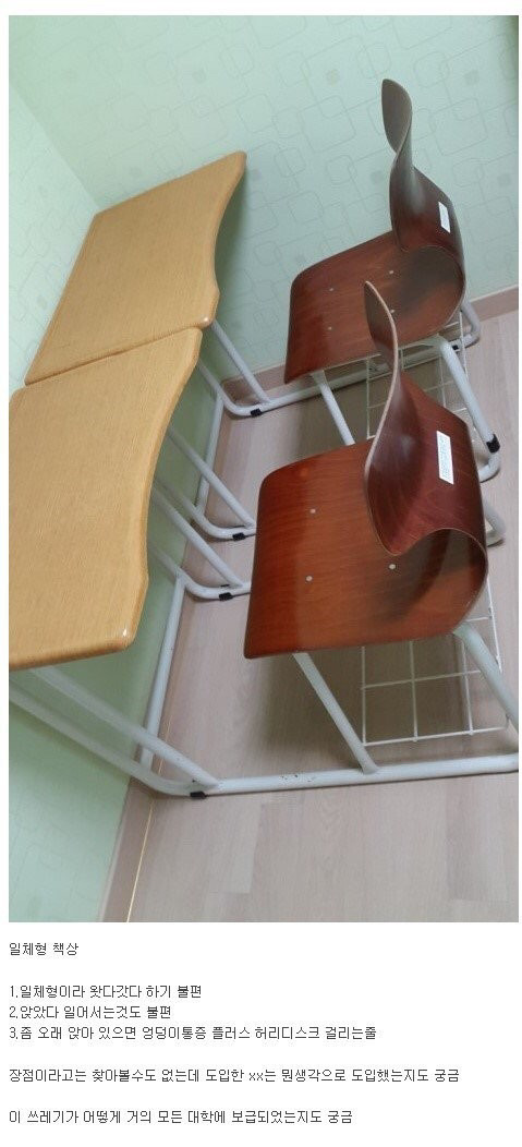 [유머]대학교 일체형 책상 대신 새로 생긴 의자.jpg 작성자김효연|작성시간18.03.16|조회수145,823 목록 댓글 21 글자크기 작게가 글자크기 크게가 출처 : http://theqoo.net/index.php?mid=square&page=2&document_srl=692429812신박한 불편한 의자 다음검색 현재 게시글 추가 기능 열기 북마크 공유하기 신고 센터로 신고 댓글 댓글 21 댓글쓰기 답글쓰기 댓글 리스트 작성자뽀뽀 | 작성시간 18.03.16 어 저는 마지막 껀 편하던데ㅋㅋㅋㅋㅋ가운데 뚫고 들어가기도 좋구.. 작성자타프 | 작성시간 18.03.17 아래것도 만만치 않게 불편한 ㅠㅠㅠㅠㅠㅠㅠㅠㅠ 작성자어남류어남선 | 작성시간 18.03.17 멀쩡한 의자 아무렇게나 만들어서 특허받고 대량으로 납품해서 돈버는건가요..신박하네요...창조 낭비.. 작성자비프스탁 | 작성시간 18.03.17 띠용 마지막 꺼 전래 편한데,,,, 작성자마고 로비 | 작성시간 18.03.19 겁나 불편 ㅠㅠ 댓글 전체보기