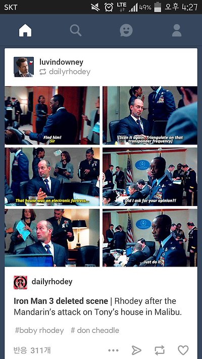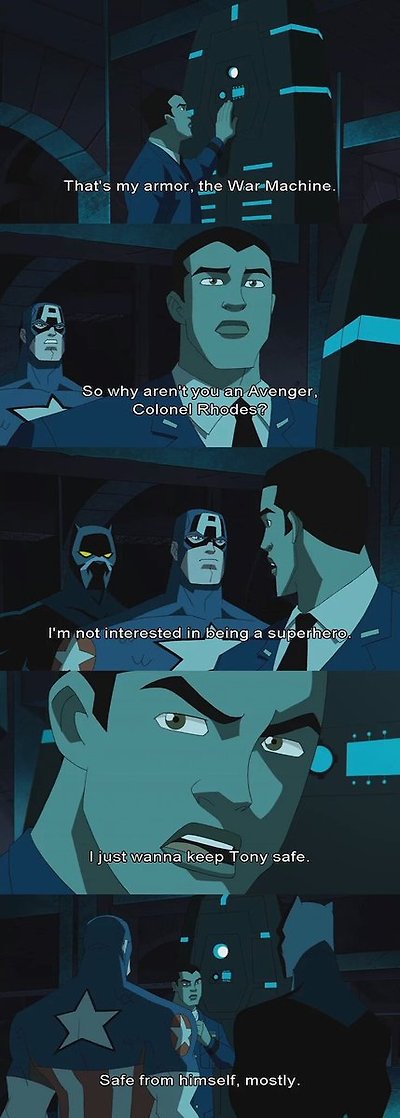 90. 솔직히 절대 로디, 페퍼, 해피를 싫어하면서 토니를 좋아할 수는 없다. 로디의 감동적인 말 중 미 국방부에서 뚫을 수 없는 토니 저택의 전자 보안...(토니: 난 14살 전에 페타곤을 뚫었는데?(퓨리:-_●덕분에 바빴다 이놈아