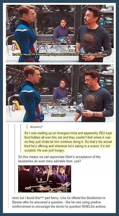 97. 토니는 영화에서 먹방씬이 꽤 있고 자잘한 간식거리도 잘 먹는데, 그런 간식 장면은 로다주가 배고파서 스탭들 몰래 촬영장 여기저기 숨겨놓은 걸 애드립으로 먹으며 찍는 것이라고. 진짜 자캐(!)에 매력적인 캐릭터성 다 때려박으시는 우리 아저씨.