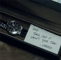 88-1. 토니는 생환 전후 받은 메시지들을 "Delete all." 한마디로 읽지도 않고 전부 삭제해버리지만, 오베디아가 선물로 준 시계는 상당히 오래 가지고 다닌다. 그를 의심했을 때도 배신이 확정된 후에도.