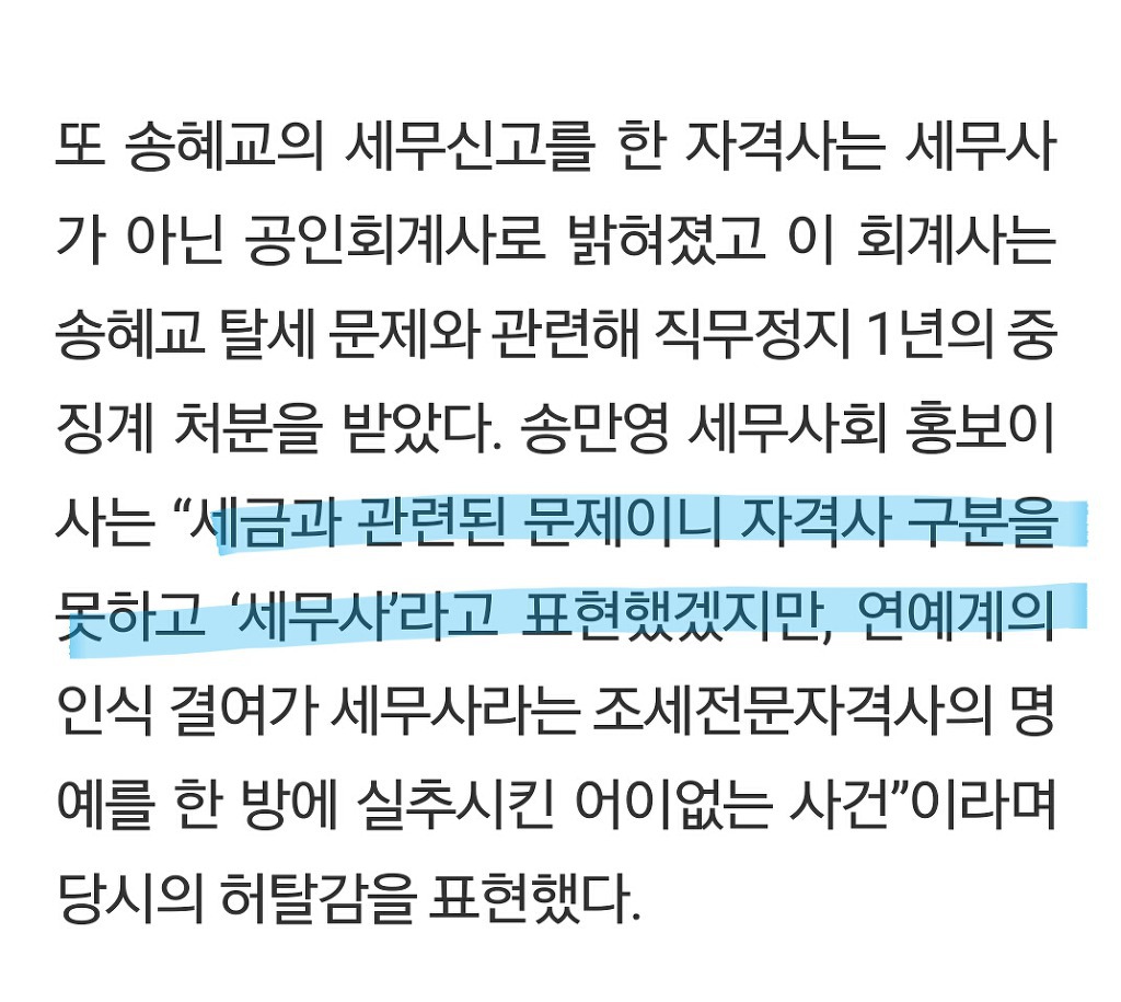 4. ㅂㅎㅇ 건보료 미납건때 세무사협회에서 세무사탓하는 사람 고소하겠다고 했는데 송혜교건은 회계사 세무사 혼동을 지적한거라고 밝힘. (송혜교가 고용한건 회계사였음)