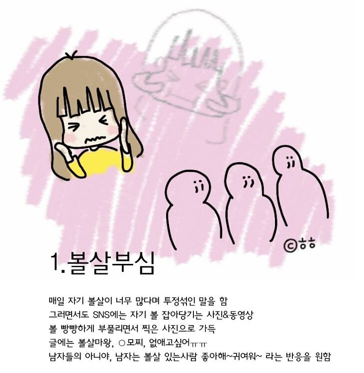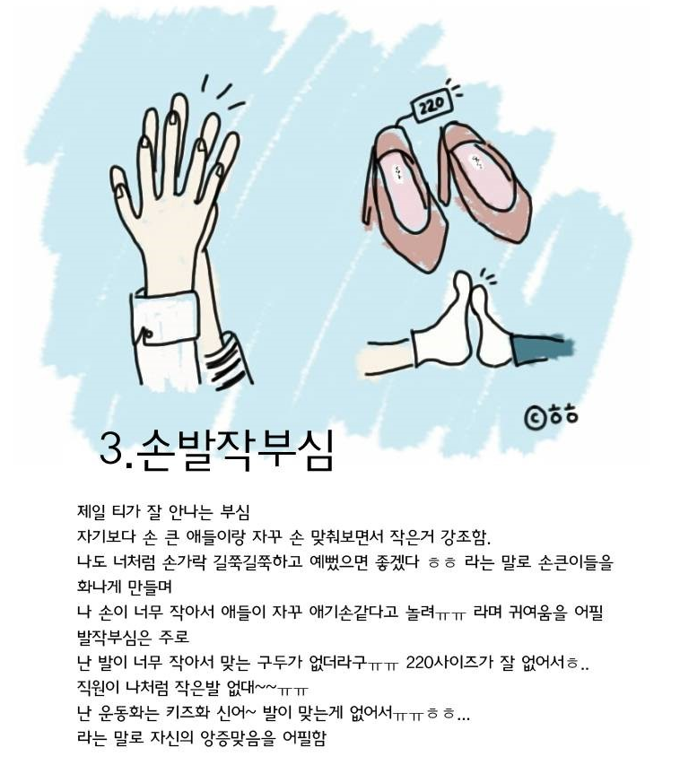 작성자pine tree 작성시간 17.01.31 전 1,2,3번 같이 볼살있고 키작고 손발작은데요 부심부리는 거 공감가요ㅋㅋㅋ 솔직히 볼살, 작은 키, 작은 손발 귀여운 요소가 될 수 있다고 생각해서 남자친구 앞에서나 부심부리지 특별나게 큰 키, 큰 손발가진 친구앞에선 은연 중에 조심해요. 그런데 진짜 컴플렉스이신 분들도 공감가고요! 가끔가다 저런 부심 티나게 부리는 자아가 좀 어린 친구...? 생각나는데 그 친구한텐 사이다라고 생각했어요ㅋㅋㅋ