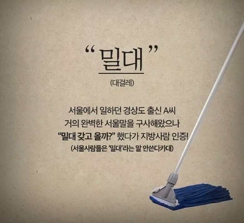 작성자빅스 첸 작성시간 18.12.10 강원도... 마대걸레 대걸레 밀대 기름걸레 다 썼어요... 그런데 밀대가 전국구로 도는 사투리였다니...!!!