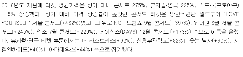 정가 대비 가격 상승률이 높았던 콘서트 티켓은 방탄소년단 월드투어 ‘LOVE YOURSELF’ 서울 콘서트(+462%)였고,