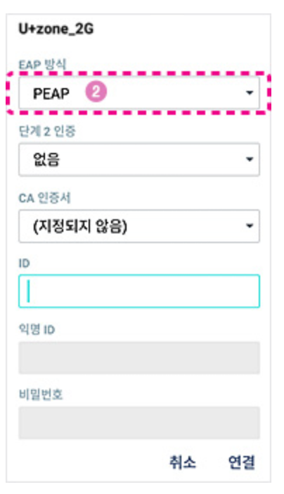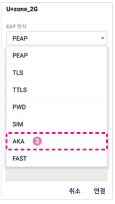 3. 팝업 형태로 작은 창이 뜨게 된다. 그러면 거기서 PEAP로 지정된 맨 위 항목(EAP 방식)을 눌러 AKA로 바꾼 후 연결버튼을 누른다.