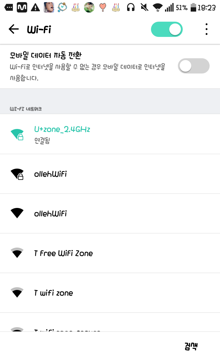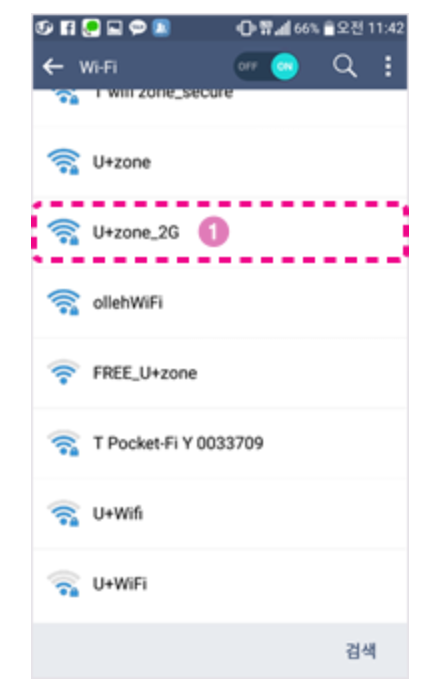글쓴이의 폰은 여기에 해당되어 2.4G로만 와이파이를 잡을 수 있습니다. 하지만 보급형이 아닌 기종들은 'U+zone'이라는 네임의 와이파이로도 연결이 가능합니다.