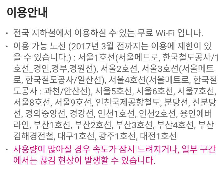 작년까지만해도 다른 통신사들은 지하철 객차 내 와이파이 사용이 가능했던 반면, 유플러스는 객차 내 와이파이가 전혀 되지 않아 아까운 데이터를 펑펑 쓰던 시절이 있었는데..