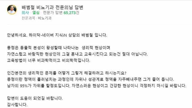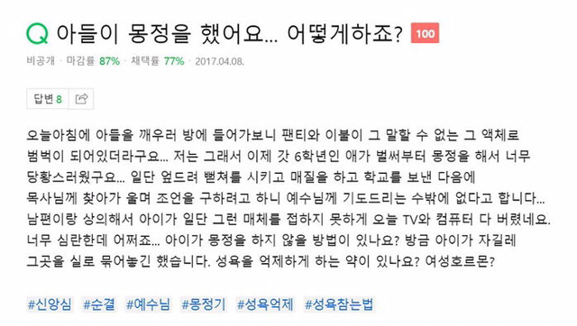 지난 8일 네이버 지식iN의 건강상담 비뇨기과 코너에는 '아들이 몽정을 했어요... 어떻게 하죠?'라는 상담 글이 올라와 큰 화제를 모았다.