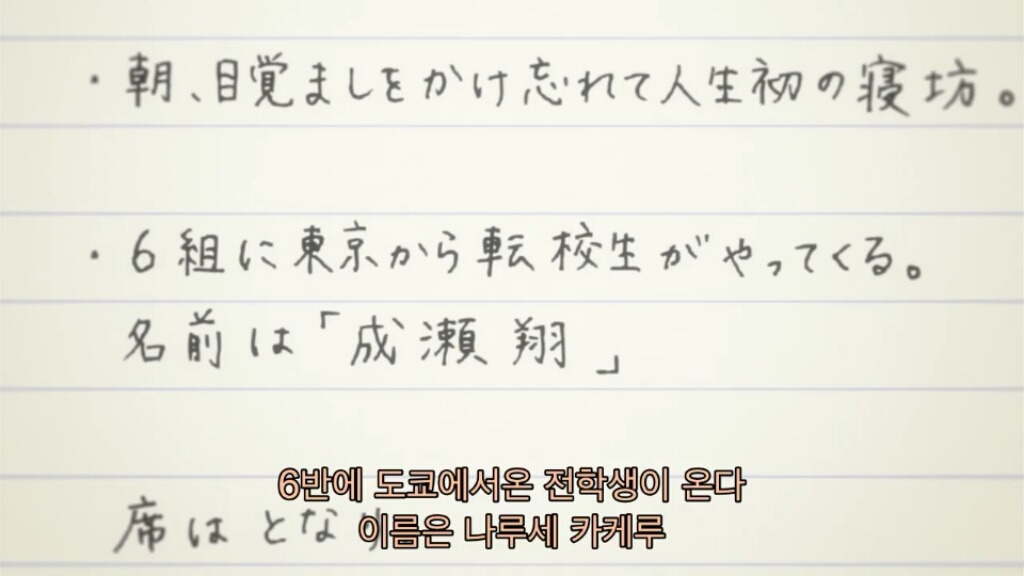 그리고 전학생 "나루세 카케루" 가 올거라 적혀있고