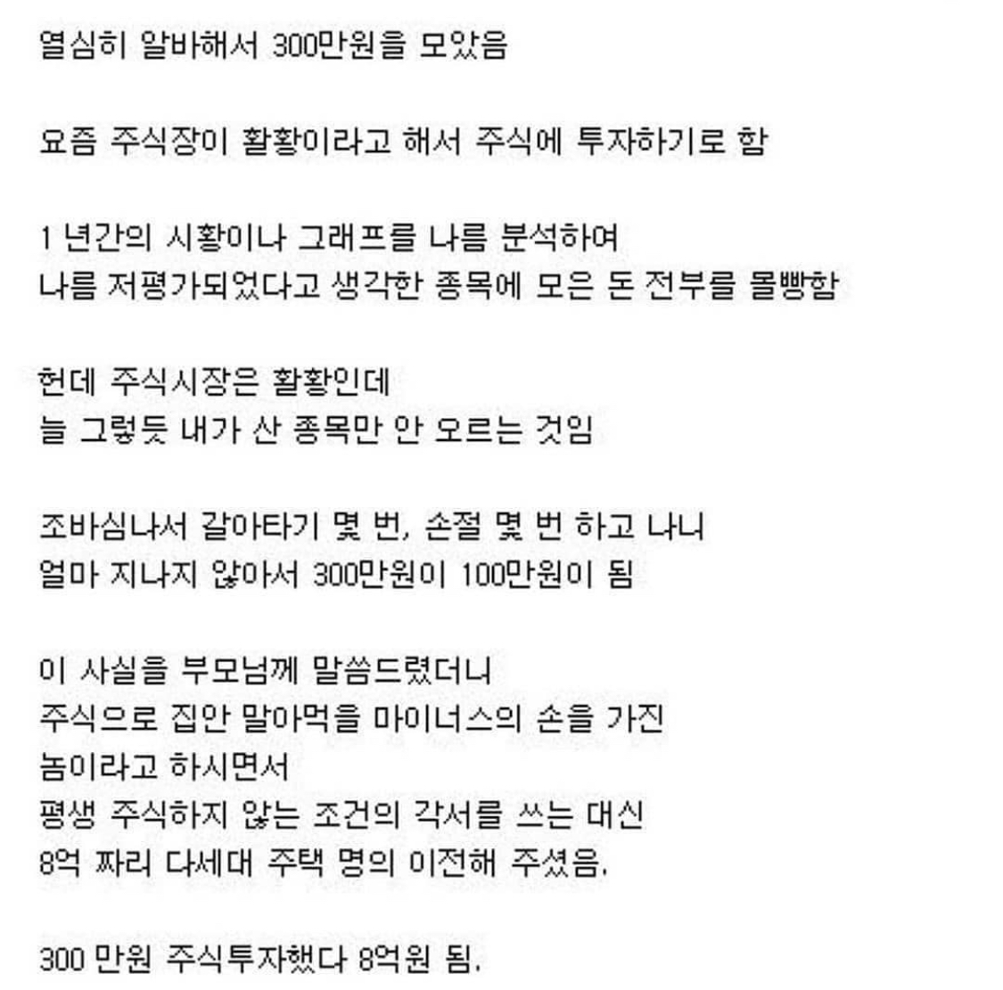 [기타]300만원으로 주식 시작했다가 8억 생김.jpg 작성자이우연|작성시간21.03.23|조회수418,970 목록 댓글 4 글자크기 작게가 글자크기 크게가 출처 : 인스타아 네.. 다음검색 현재 게시글 추가 기능 열기 북마크 공유하기 신고 센터로 신고 댓글 댓글 4 댓글쓰기 답글쓰기 댓글 리스트 작성자애절쿠려 | 작성시간 21.03.23 누구 놀리나 작성자자몽그린티 | 작성시간 21.03.23 뭐꼬! 작성자gialeleli | 작성시간 21.03.23 이 글도 예전에 올라온 거라 지금 10억 넘을 거에요. 작성자돼지담요정 | 작성시간 21.03.23 장난하나........... 댓글 전체보기