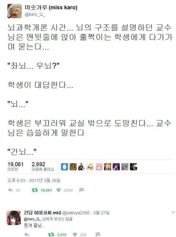 답댓글 작성자최공 작성자 본인 여부 작성자 작성시간 17.06.11 교수 : 자네.....우네....? (좌뇌... 우뇌...?)