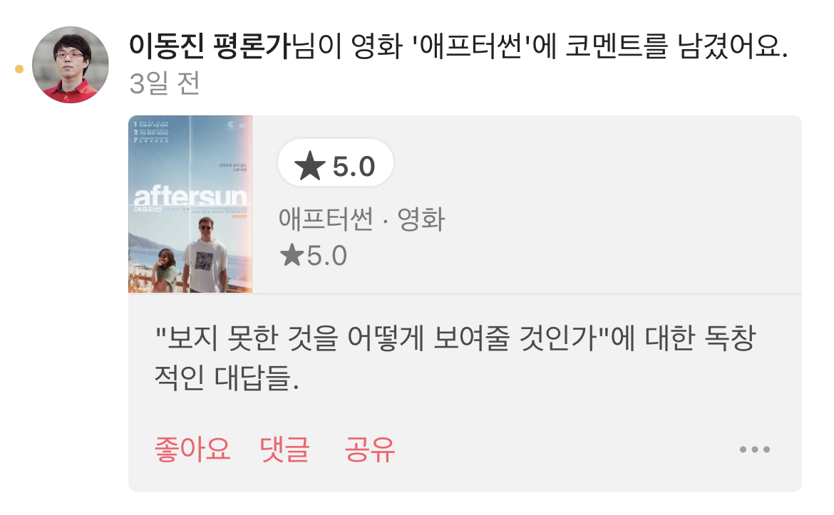 작성자케이틀린 디버 작성시간 23.02.08 전 기대보다 별로였어요.. 평론가들이 어떤 부분에서 환장하는지는 알겠는데 그냥 너무 지루하고 불친절하고 그랬어요ㅋㅋ 전 이런 인디영화 좋아하는데도요...ㅠ