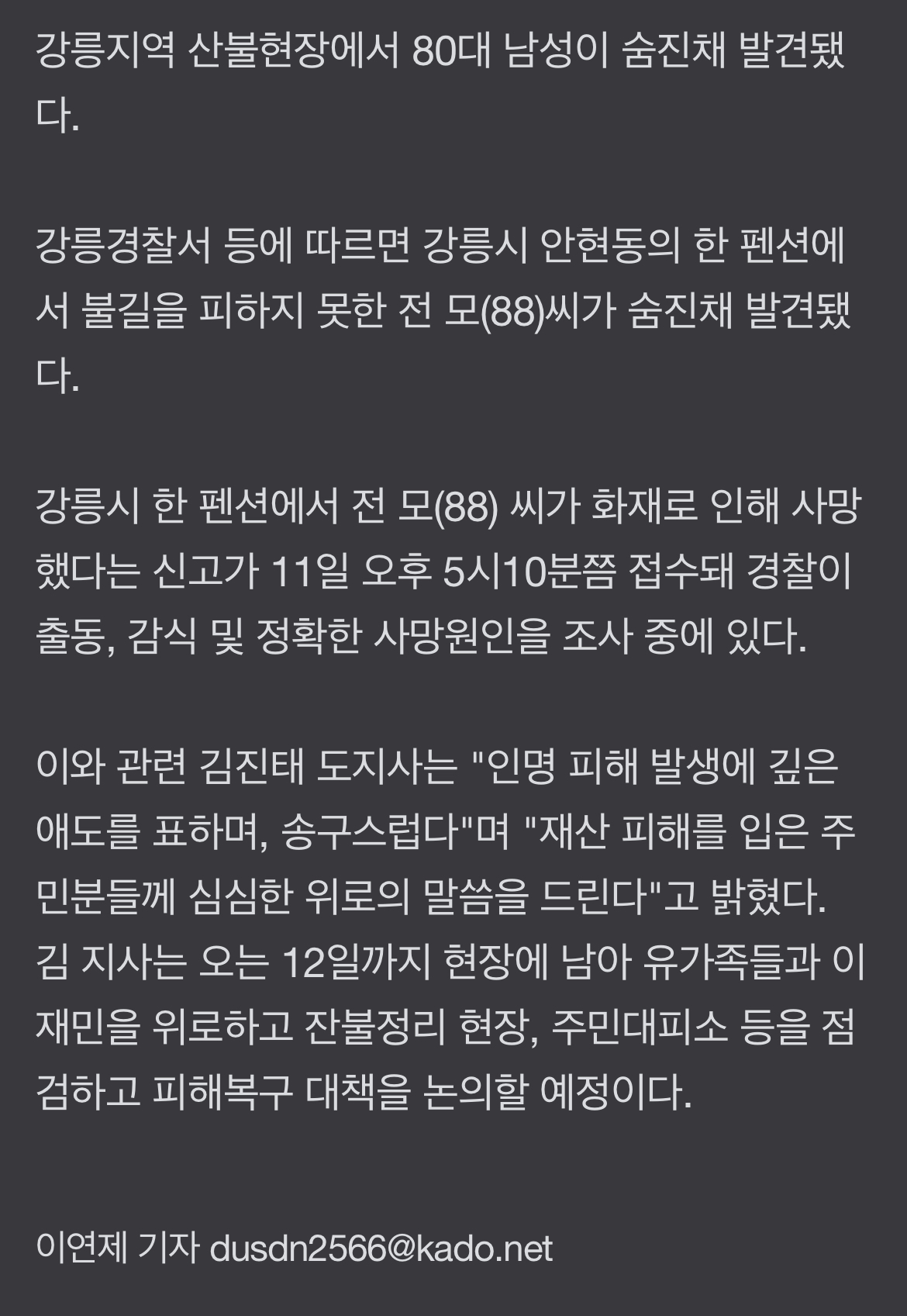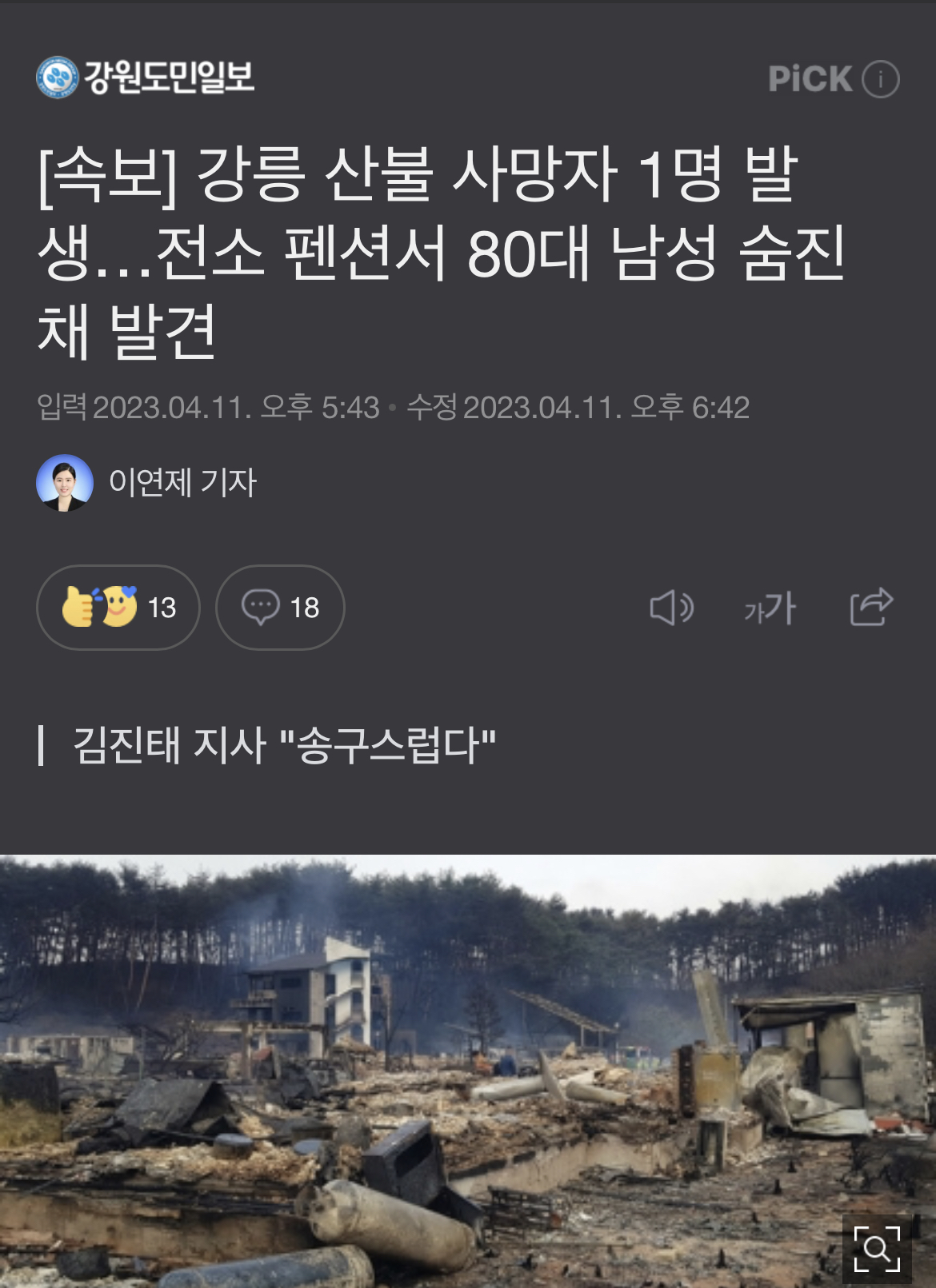 [사회][속보]강릉 산불 사망자 1명 발생...전소 펜션서 80대 남성 숨진채 발견 작성자S노을빛진달래E|작성시간23.04.11|조회수1,368 목록 댓글 7 글자크기 작게가 글자크기 크게가 삼가 고인의 명복을 빕니다 출처 :https://n.news.naver.com/article/654/0000037300?sid=102 다음검색 현재 게시글 추가 기능 열기 북마크 공유하기 신고 센터로 신고 댓글 댓글 7 댓글쓰기 답글쓰기 댓글 리스트 작성자later | 작성시간 23.04.11 삼가 고인의 명복을 빕니다 작성자필테의신이되고싶은 | 작성시간 23.04.11 삼가 고인의 명복을 빕니다 작성자성심당역 | 작성시간 23.04.11 삼가 고인의 명복을 빕니다 작성자빛나는야옹이 | 작성시간 23.04.11 삼가 고인의 명복을 빕니다 작성자나는나 | 작성시간 23.04.12 삼가 고인의 명복을 빕니다. 댓글 전체보기