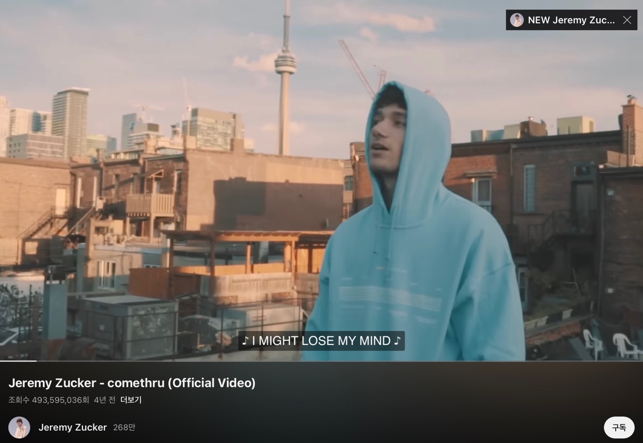 제레미 주커의 Comethru라는 노래로 유튜브 조회 수가