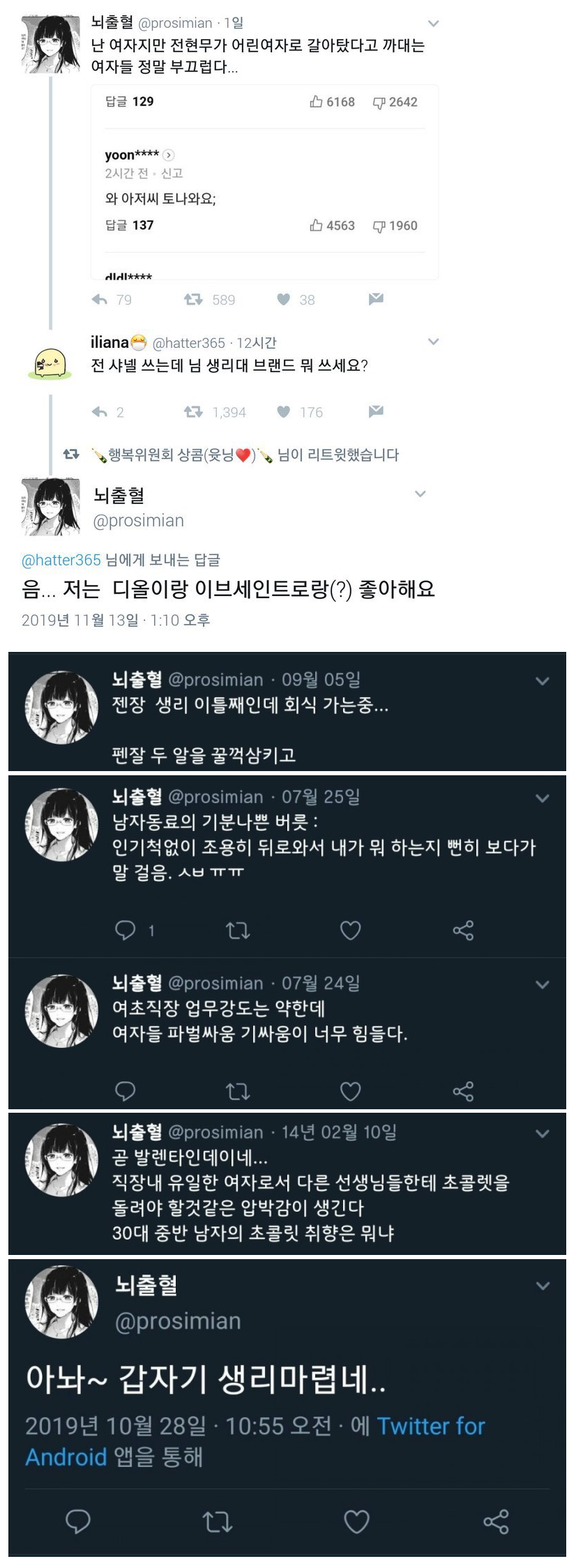 [기타]전 샤넬 쓰는데 님은 생리대 브랜드 뭐 쓰세요? 작성자장현량음|작성시간23.09.05|조회수4,301 목록 댓글 4 글자크기 작게가 글자크기 크게가 출처 : 더쿠솔직히 내몸에 닿는건데 생리대는 에르메스 정돈 써줘야죠; 다음검색 현재 게시글 추가 기능 열기 북마크 공유하기 신고 센터로 신고 댓글 댓글 4 댓글쓰기 답글쓰기 댓글 리스트 작성자댕요미 | 작성시간 23.09.05 출혈아 여자가 되고시퍼? 작성자네 사랑이 무사하기를 | 작성시간 23.09.05 개토나와요..와우.. 작성자별빛이지면⁷ | 작성시간 23.09.05 욕도 아깝다 작성자figtree | 작성시간 23.09.06 저런 짓 하면 자괴감 들 거 같은데.. 댓글 전체보기