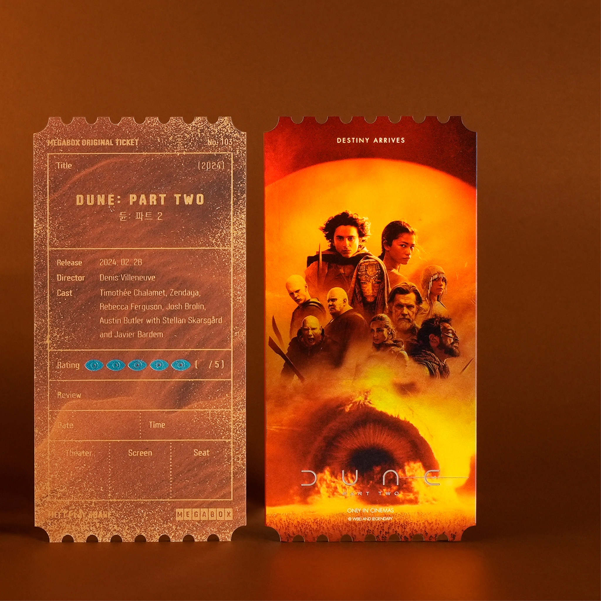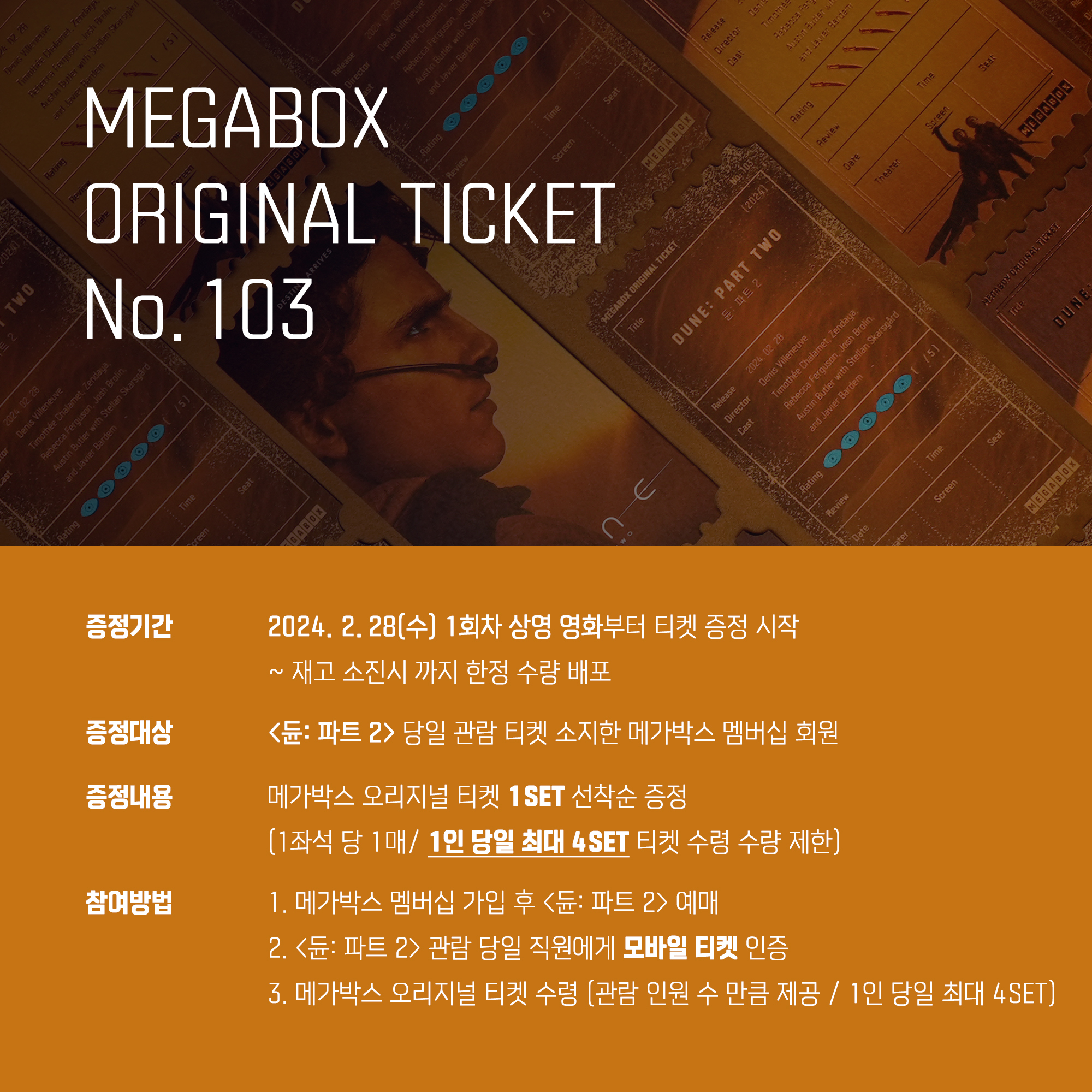 소주담(談) : 소소한 주민들의 이야기 [기타]메가박스 <듄: 파트 2> 오리지널 티켓 공개 & 증정 이벤트 작성시간24.02.26|조회수2,722 목록 댓글 10 글자크기 작게가 글자크기 크게가 출처 : 메가박스 인스타그램 다음검색 현재 게시글 추가 기능 열기 북마크 공유하기 신고 센터로 신고 댓글 10 댓글 리스트 답댓글 작성시간 24.02.26 하나 더 사야겠네요 감사합니다! 작성시간 24.02.26 2번에는 2종이군요 작성시간 24.02.26 메박은 관람 후 수령인가요?? 답댓글 작성시간 24.02.26 멀티플렉스 3사 중에서 메박만 관람 전에도 수령가능해요 답댓글 작성시간 24.02.26 감사합니다! 카페 방문해 더 많은 댓글 만나기!