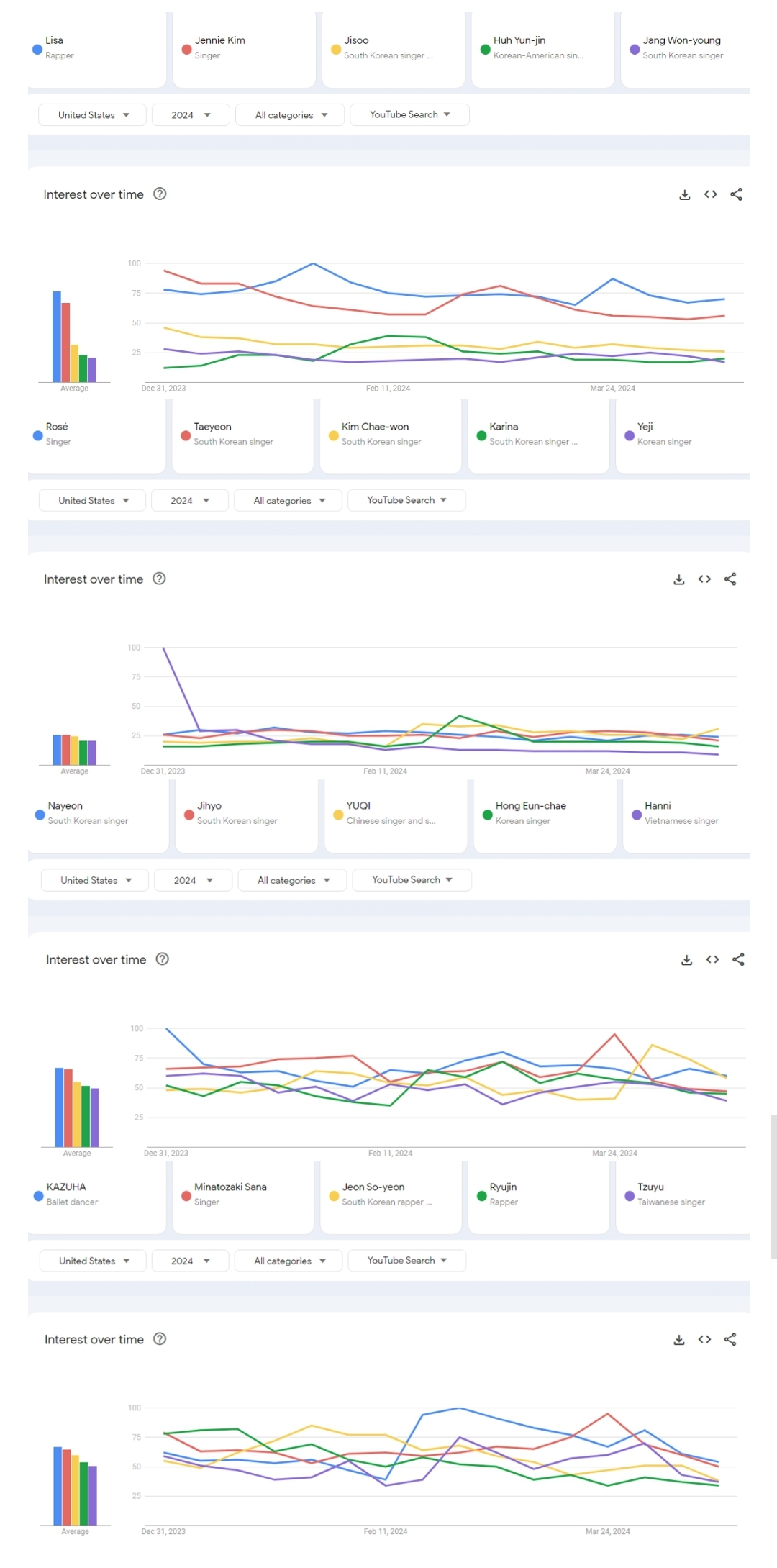 2024년 현재까지 미국 유튜브에서 가장 많이 검색된 케이팝 여자아이돌그룹 멤버 TOP20