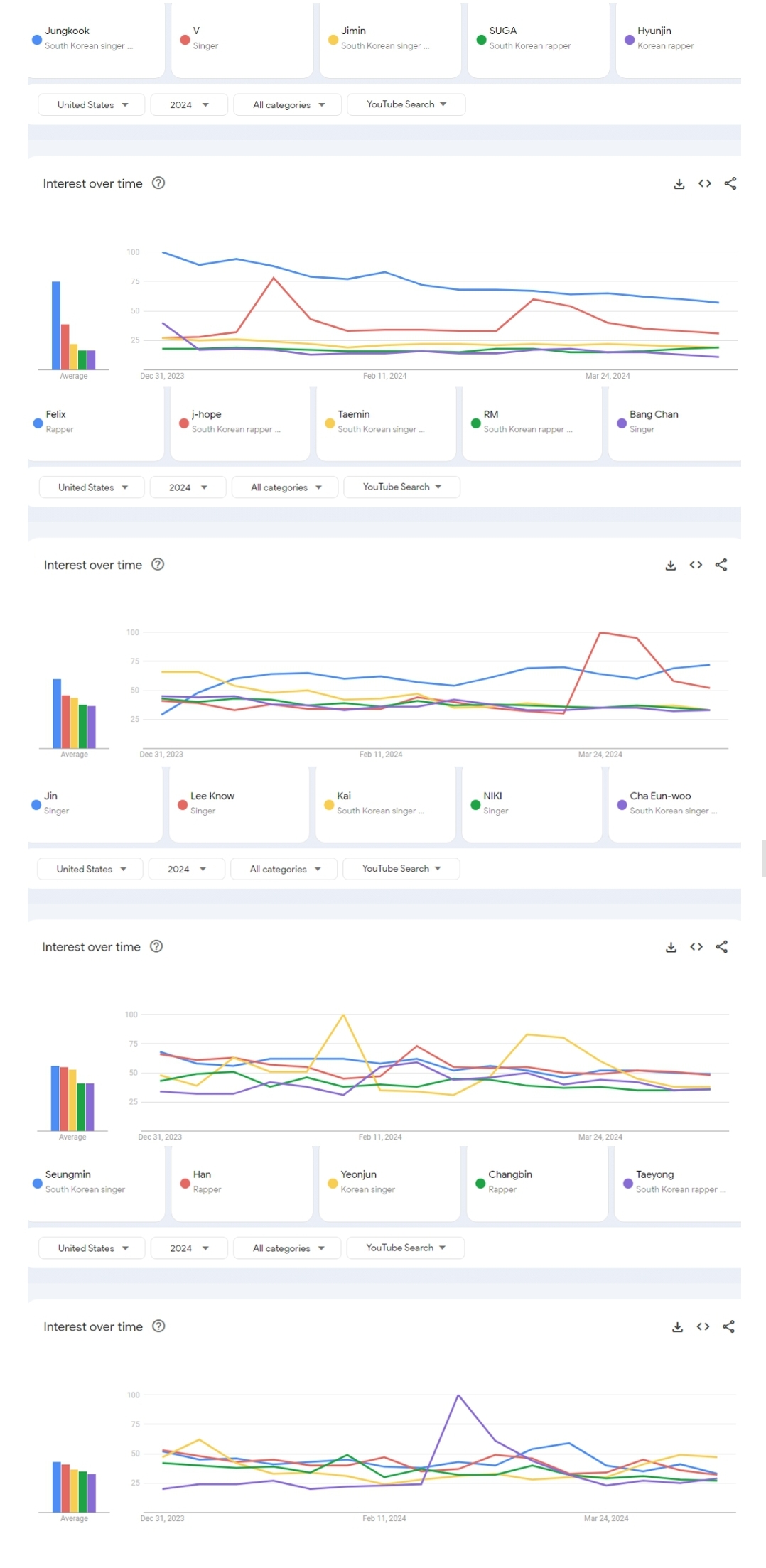 2024년 현재까지 미국 유튜브에서 가장 많이 검색된 케이팝 남자아이돌그룹 멤버 TOP20