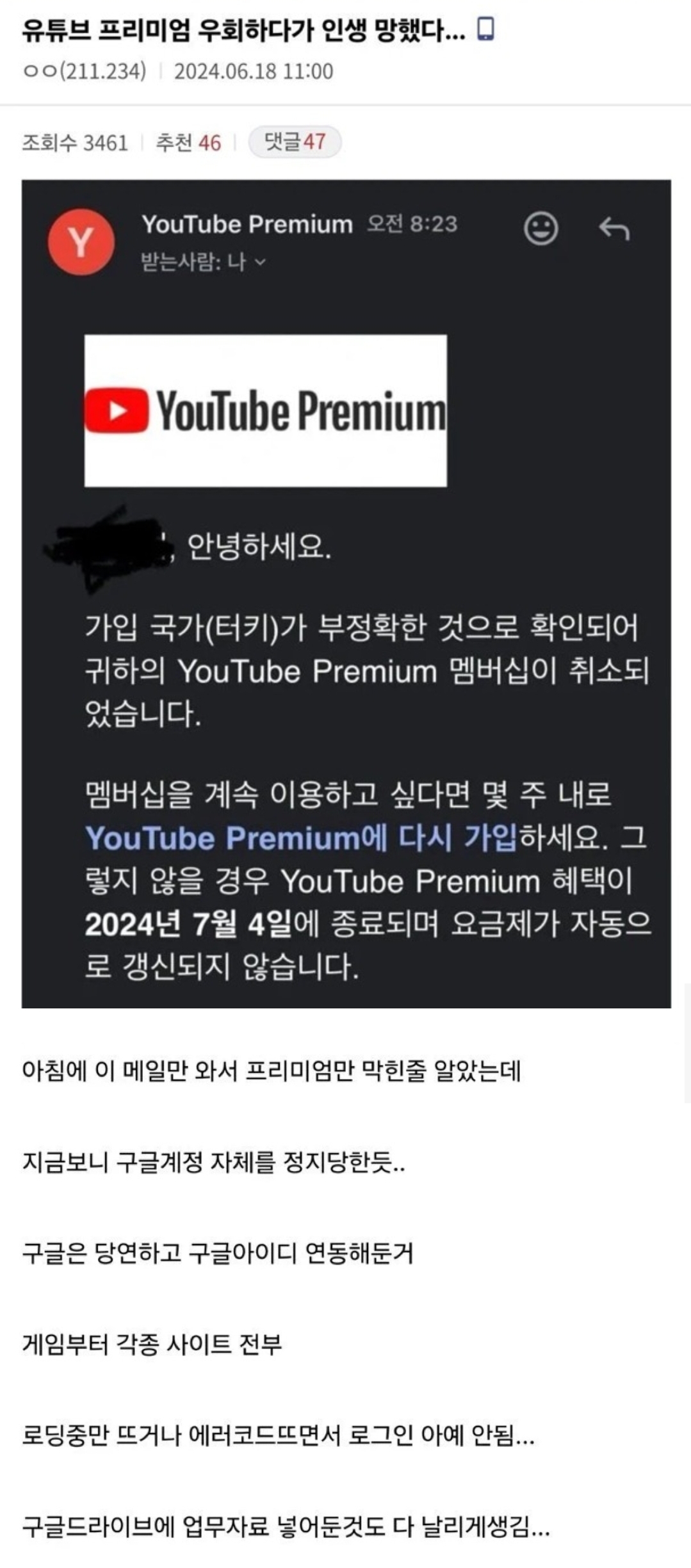 CAFE [기타] 유튜브 프리미엄 우회하다가 인생 망한 디시인 소주담(談) : 소소한 주민들의 이야기 작성시간24.06.20 앱으로보기 출처 :디시인사이드 카페방문 댓글 17 현재 게시글 추가 기능 열기 공유하기 신고 센터로 신고