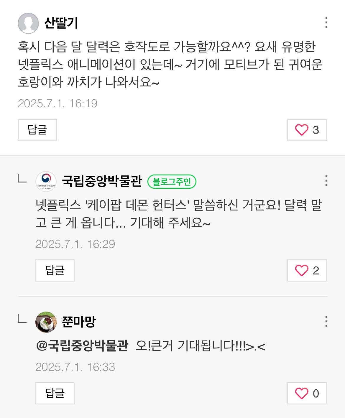 소주담(談) : 소소한 주민들의 이야기 [정보][ 국립중앙박물관 X 케이팝 데몬 헌터스 ] 큰 게 옵니다...... 작성시간25.07.01|조회수8,741 목록 댓글 14 글자크기 작게가 글자크기 크게가 출처 : https://newduck.net/plaza/109664601제발 국중박!! 더피 & 서치 굿즈 플리즈!!! 다음검색 현재 게시글 추가 기능 열기 북마크 공유하기 신고 센터로 신고 댓글 14 댓글 리스트 작성시간 25.07.02 갸아악 작성시간 25.07.02 감다살 작성시간 25.07.02 소리벗고 팬티질러~!!!!! 작성시간 25.07.02 ㅁㅊ다 인형 기대합니다 작성시간 25.07.02 헐 카페 방문해 더 많은 댓글 만나기!