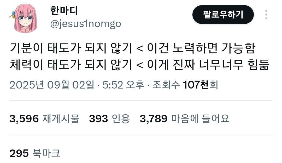 작성시간 25.09.05 체력이 인성이다 라는 말 제 인생 모토에요 ㅋㅋ