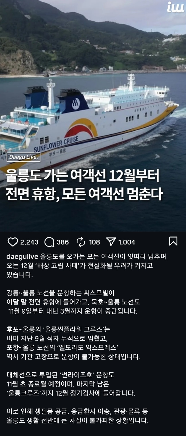 [스크랩] [정보]12월 비상이 걸려버린 울릉도 작성자선재 엎고 튀어|작성시간25.10.22|조회수5,694 목록 댓글 4 글자크기 작게가 글자크기 크게가 다음검색 스크랩 원문 : 스카이 스크래퍼스 (SKYSCRAPERS) 현재 게시글 추가 기능 열기 북마크 공유하기 신고 센터로 신고 댓글 댓글 4 댓글쓰기 답글쓰기 댓글 리스트 작성자맥락맹혐오증 | 작성시간 25.10.22 배 자체가 싹 다 멈추면 그냥 고립인거잖아요… 작성자레드부 | 작성시간 25.10.22 헉 울릉도 사는 사람들은 어떡해요... 작성자BOYNEXTDOOR | 작성시간 25.10.22 아니이러면 그냥 고립인거예요? 이동수단이 아예 0인거예요? 작성자에피톤프로젝트 | 작성시간 25.10.23 원래 울릉도 사람들 겨울되면 다 육지로 나온다면서요? 그땐 왕래가 거의 없을것 같긴 하네요. 댓글 전체보기
