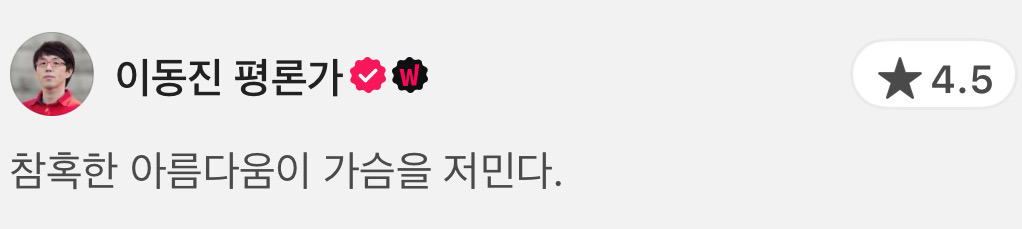 [기타]영화 <프랑켄슈타인> 이동진 평론가 평점.jpg 작성자작은별|작성시간25.10.26|조회수1,774 목록 댓글 4 글자크기 작게가 글자크기 크게가 출처 : 왓챠피디아 다음검색 현재 게시글 추가 기능 열기 북마크 공유하기 신고 센터로 신고 댓글 댓글 4 댓글쓰기 답글쓰기 댓글 리스트 작성자물과꿈 | 작성시간 25.10.26 뭔가 생각한 것보다는 무난무난 했지만 끝으로 갈수록 좋았어요 음악도 좋았습니다 작성자전진 | 작성시간 25.10.26 별점 높네요. 제 취향은 아니었어서.. 작성자소요 | 작성시간 25.10.27 너무 좋았어요 아름답다고 해야하나 극장에서 봐야하는 영화에요 답댓글 작성자西島隆弘 | 작성시간 25.11.10 2222222 제가 본 올해 영화 중 1위..넷플 말고 영화관에서 보고싶었어요ㅠㅠㅠㅠㅠㅠ 댓글 전체보기