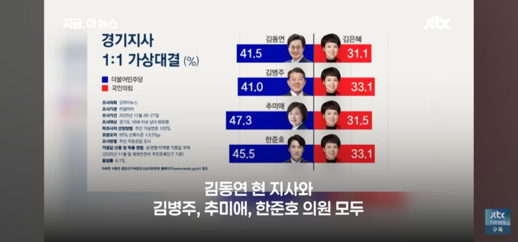 [정치]경기도지사 지지율 1위 추미애 작성자겨울이야기|작성시간25.12.30|조회수872 목록 댓글 1 글자크기 작게가 글자크기 크게가 출처 : jtbc 다음검색 현재 게시글 추가 기능 열기 북마크 공유하기 신고 센터로 신고 댓글 댓글 1 댓글쓰기 답글쓰기 댓글 리스트 작성자Requiem | 작성시간 25.12.30 저 죽일놈의 30%들은 무병단수 했으면 좋겠습니다 댓글 전체보기