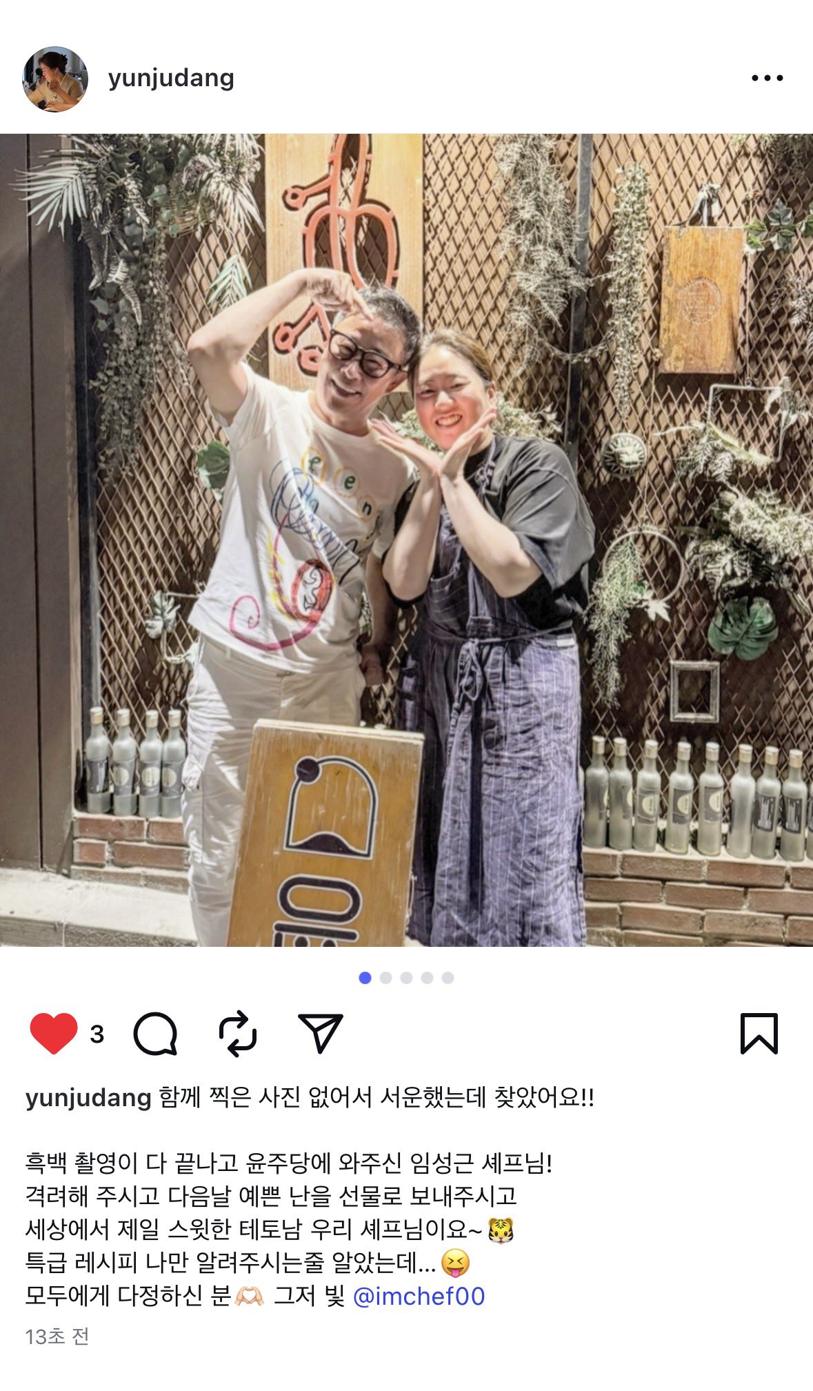 [기타]흑백2 윤주모 인스타 업뎃 (feat 임짱의 난 선물 ㄷㄷ) 작성자태향촌고추장|작성시간26.01.03|조회수17,932 목록 댓글 5 글자크기 작게가 글자크기 크게가 출처 :https://x.com/Saamche0118/status/2007368063428243627 다음검색 현재 게시글 추가 기능 열기 북마크 공유하기 신고 센터로 신고 댓글 댓글 5 댓글쓰기 답글쓰기 댓글 리스트 작성자왕토마토 | 작성시간 26.01.03 주모님께 존칭어 쓰시고 마지막에 종 같이 누르는것도 보기좋았어요🥰 작성자잘살자 | 작성시간 26.01.03 우왕ㅋㅋㅋㅋ 보기 좋아요! 작성자송 하 나 | 작성시간 26.01.03 "한식대첩3 우승자" ㅋㅋㅋㅋ넘 귀여우셔욬ㅋ 작성자임짱 | 작성시간 26.01.03 한식대첩3 우승자 ㅋㅋㅋㅋㅋ 작성자Florence Pugh | 작성시간 26.01.03 너무 훈훈해요 댓글 전체보기