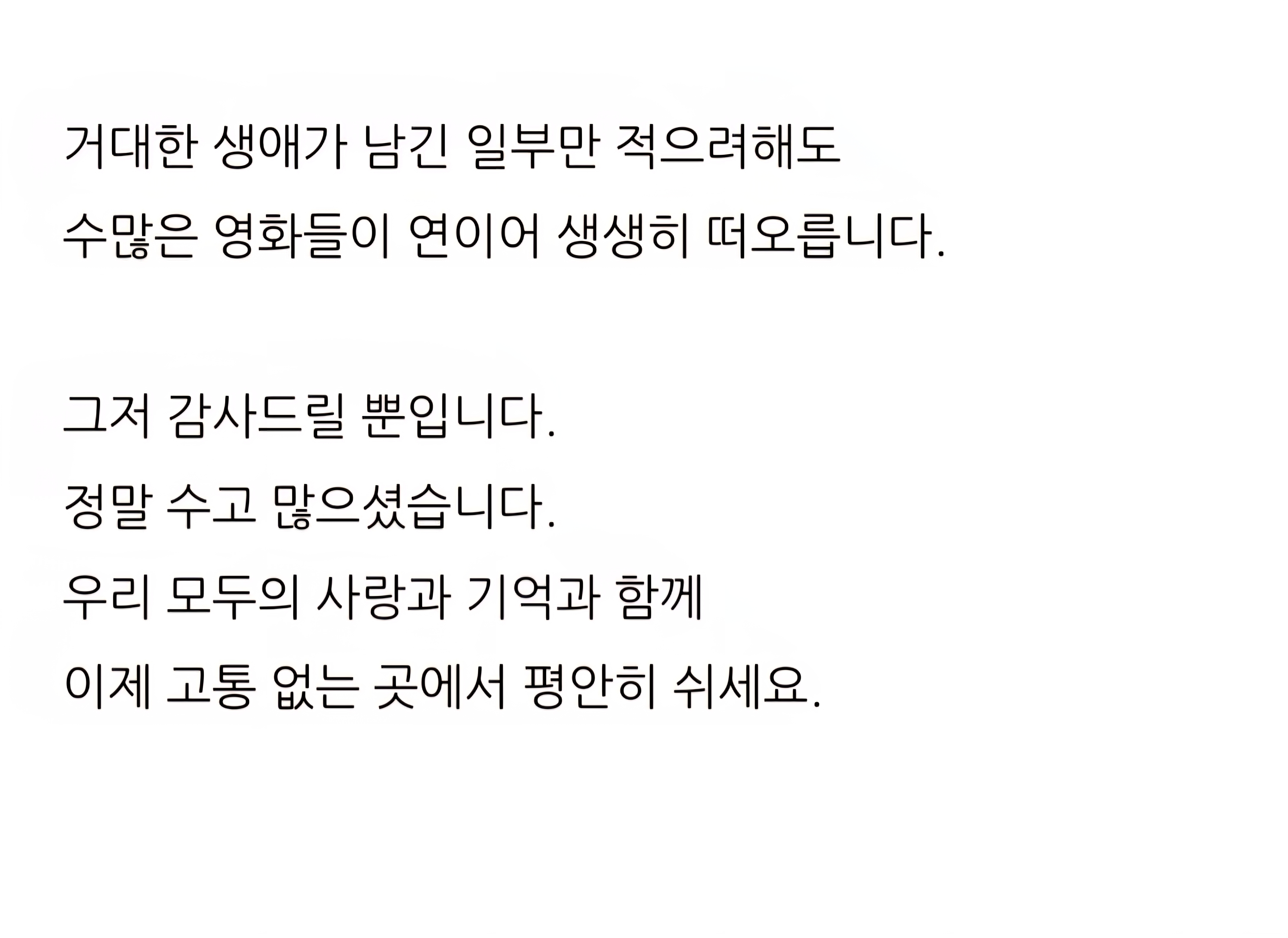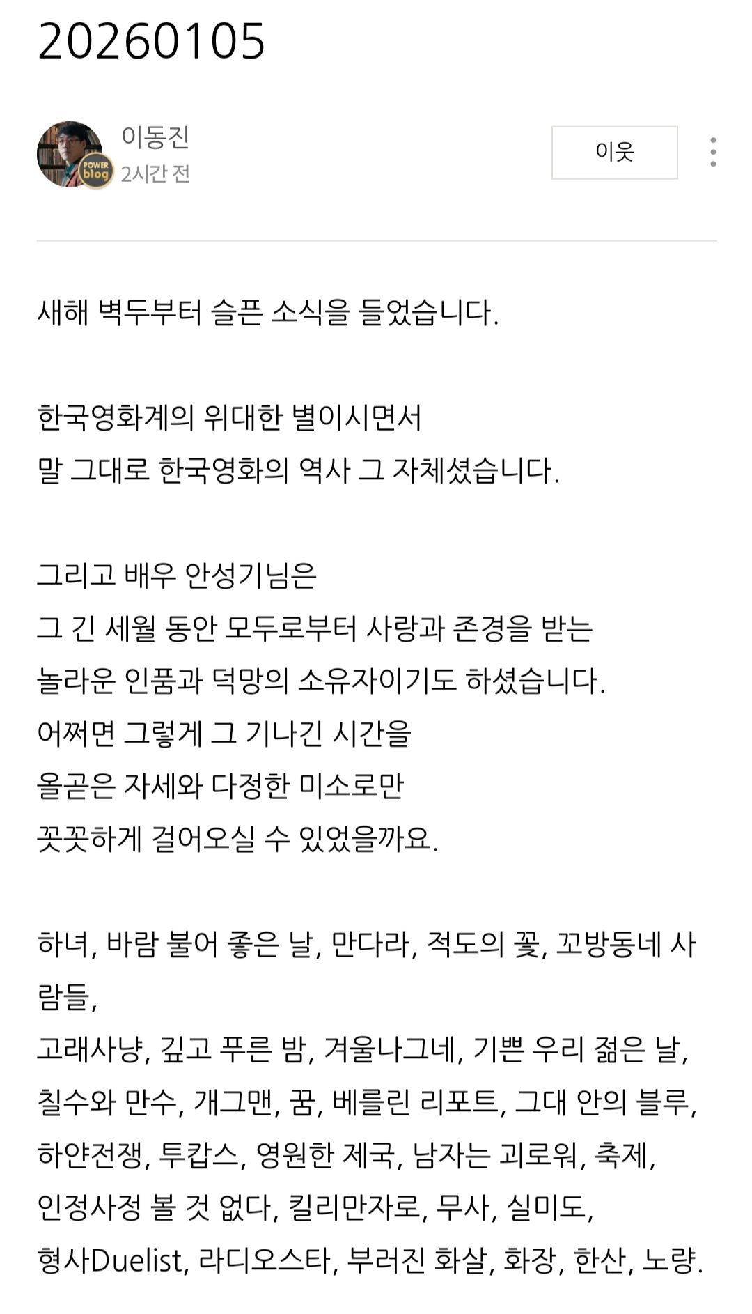 [기타]이동진 평론가의 배우 안성기 추모글.blog 작성자Florence Pugh|작성시간26.01.05|조회수1,999 목록 댓글 1 글자크기 작게가 글자크기 크게가 출처 : 이동진 평론가 네이버 블로그 [언제나 영화처럼] 다음검색 현재 게시글 추가 기능 열기 북마크 공유하기 신고 센터로 신고 댓글 댓글 1 댓글쓰기 답글쓰기 댓글 리스트 작성자작은별 | 작성시간 26.01.05 울컥... ㅠ 댓글 전체보기