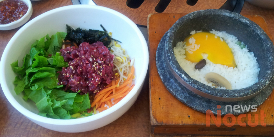 양념이 된 육회비빔밥과는 달리 양념이 거의 없는 편.