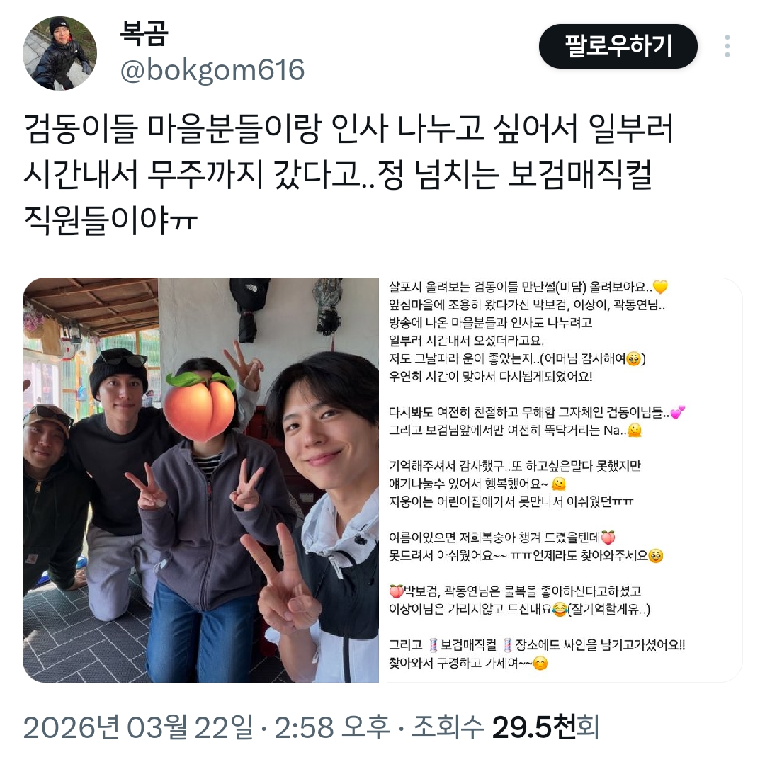 [연예][보검매직컬] 검동이들 마을분들이랑 인사 나누고 싶어서 일부러 시간내서 무주까지 갔다고.X 작성자Florence Pugh|작성시간26.03.23|조회수6,515 목록 댓글 3 글자크기 작게가 글자크기 크게가 출처 : https://x.com/i/status/2035597026583609464 다음검색 현재 게시글 추가 기능 열기 북마크 공유하기 신고 센터로 신고 댓글 댓글 3 댓글쓰기 답글쓰기 댓글 리스트 작성자BOYNEXTDOOR | 작성시간 26.03.23 애기들 어린이집 간 시간에 갔으면 선희 지희 다인이 못보고 갔으려나요 ㅠㅠ 애들이랑 정든모습 너무 보기 좋은데... 라여사님 어여사님 다른분들도 모두 다 건강하시길~ 작성자계란은완숙 | 작성시간 26.03.23 막방 다가오는 거 아쉬워요 작성자miraclein | 작성시간 26.03.23 아이들이 만들어준 팔찌 하고 간 쎈스 다인이 집도 들렀다던데 보고 왔으면 좋았을텐대요 댓글 전체보기