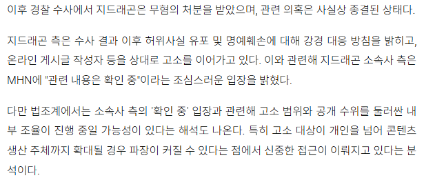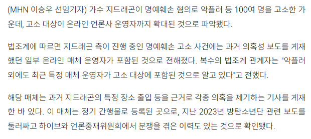 [연예][단독] 지드래곤, '의혹 보도 언론사' 운영자까지 고소…악플러 넘어 범위 확장 작성자사마귀|작성시간14:27|조회수423 목록 댓글 2 글자크기 작게가 글자크기 크게가 출처 : https://www.mhnse.com/news/articleView.html?idxno=519990 다음검색 현재 게시글 추가 기능 열기 북마크 공유하기 신고 센터로 신고 댓글 댓글 2 댓글쓰기 답글쓰기 댓글 리스트 작성자아이조아 | 작성시간 14:36 new 굿굿 아직도 멍소리 하는 사람 많은데 다 잡아갔으면 작성자잊공주 | 작성시간 14:48 new 오굿👍 댓글 전체보기