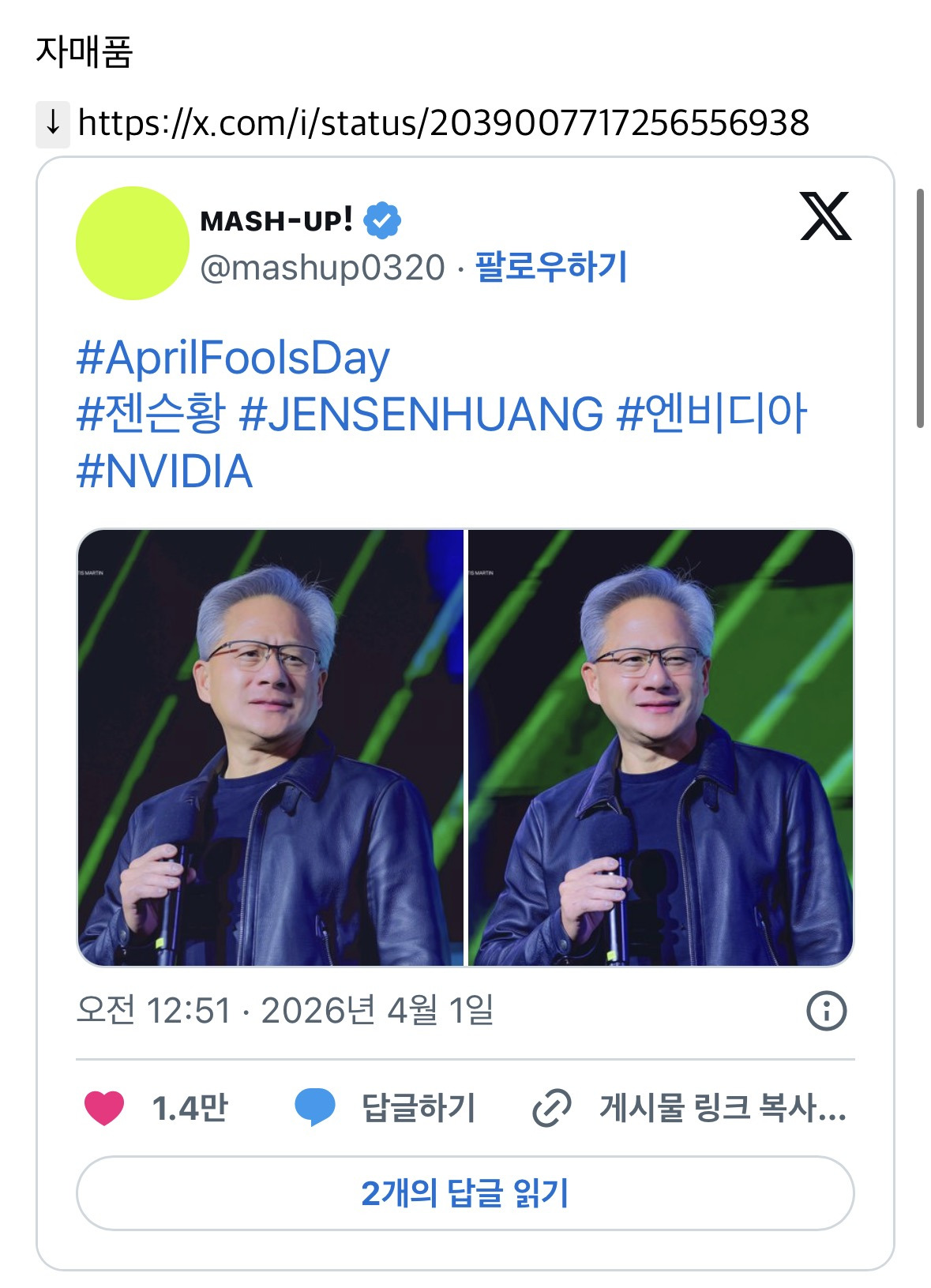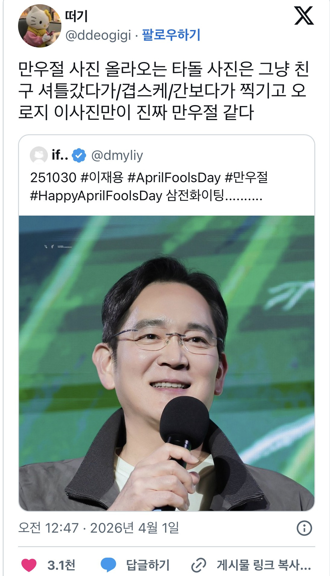 [유머]@: 만우절 사진 올라오는 타돌 사진은 그냥 친구 셔틀갔다가/겹스케/간보다가 찍기고 오로지 이사진만이 진짜 만우절 같다 작성자여행의이유|작성시간26.04.01|조회수1,601 목록 댓글 4 글자크기 작게가 글자크기 크게가 출처 : https://x.com/i/status/2039006803640586416https://x.com/i/status/2039007717256556938 다음검색 현재 게시글 추가 기능 열기 북마크 공유하기 신고 센터로 신고 댓글 댓글 4 댓글쓰기 답글쓰기 댓글 리스트 작성자사바삼사라 | 작성시간 26.04.01 아니.. 아이돌 보정까지ㅋㅋㅋㅋㅋㅋ 작성자기다리던그날이왔습니다 | 작성시간 26.04.01 보정이 ㅋㅋㅋㅋㅋㅋ 작성자더피 | 작성시간 26.04.01 엌ㅋㅋㅋㅋㅋㅋ 아니 보정 무슨일 ㅋㅋㅋㅋㅋㅋㅋㅋㅋ 고퀄 작성자Green Grape | 작성시간 26.04.01 보정ㅋㅋㅋㅋㅋㅋㅋㅋㅋ 댓글 전체보기