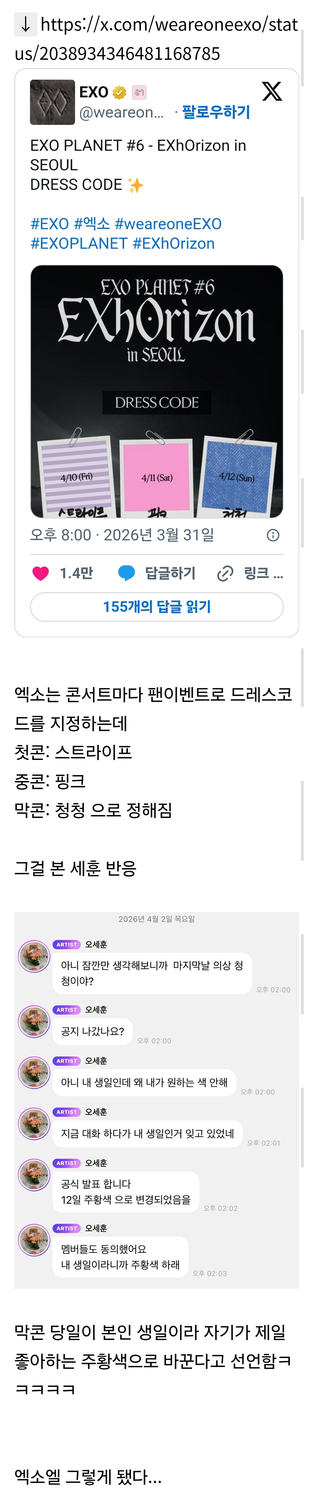 [연예]콘서트 드레스코드 육성공지하는 엑소 세훈 작성자태향촌고추장|작성시간26.04.02|조회수16,042 목록 댓글 2 글자크기 작게가 글자크기 크게가 출처 :더쿠+리더도 따로 공지해줌 ㅋㅋㅋㅋ 다음검색 현재 게시글 추가 기능 열기 북마크 공유하기 신고 센터로 신고 댓글 댓글 2 댓글쓰기 답글쓰기 댓글 리스트 작성자구운란 | 작성시간 26.04.02 아니 ㅋㅋㅋㅋㅋㅋㅋㅋㅋㅋㅋ 작성자더피 | 작성시간 26.04.02 앜ㅋㅋㅋㅋㅋㅋㅋㅋ 아 웃겨 청청보단 오렌지가 나아요 오세후니 귀여워... 댓글 전체보기