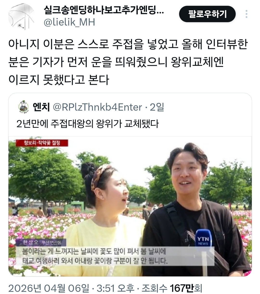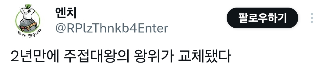 [유머]2년만에 주접대왕의 왕위가 교체됐다 작성자태향촌고추장|작성시간26.04.08|조회수4,383 목록 댓글 3 글자크기 작게가 글자크기 크게가 출처 :트위터아직 교체 안됨 ㅋㅋㅋㅋㅋㅋ 다음검색 현재 게시글 추가 기능 열기 북마크 공유하기 신고 센터로 신고 댓글 댓글 3 댓글쓰기 답글쓰기 댓글 리스트 작성자선우찬 | 작성시간 26.04.08 왕위교체ㅋㅋ저는 이번에 다큐3일에나왔던 남자분이 여친보고싶어서 운게 최고인거같아요! 작성자miraclein | 작성시간 26.04.08 아직이요 ㅋㅋㅋ 첫번째분은 남자분도 남자분이지만 아내분의 사랑스러움이 넘사라 안돼요 귀여운 리액션땜에 남자분 주접이 더 빛을 발한 느낌이예요 작성자뚜비뚜비뚜 | 작성시간 26.04.08 ㅋㅋㅋㅋㅋㅋㅋㅋㅋㅋㅋ 댓글 전체보기