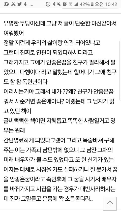 좀 있으니까 실감이 나기 시작하는데 아 꿈이여서 다행이다 근데 뭔 그런 남자가 다있지 싶었음 그러다 꿈이 너무 뒤숭숭해서 내용을 곱씹어보는데 돈은 살아서 받아 이 말이 자꾸 웅웅 울리면서 귓가에 맴도는거임 찝찝한게 기분이 너무 나빴음 그러다 출출해서 소세지 하나 먹고 씻고 웹툰 보고 있는데 나랑 제일 친한 친구한테 문자가 온거임 얘가 가족친척 아무도 그런 사람이 없다는데 신기가 좀 있음 얘기가 너무 길어질거 같으니까 친구 얘기는 안할게