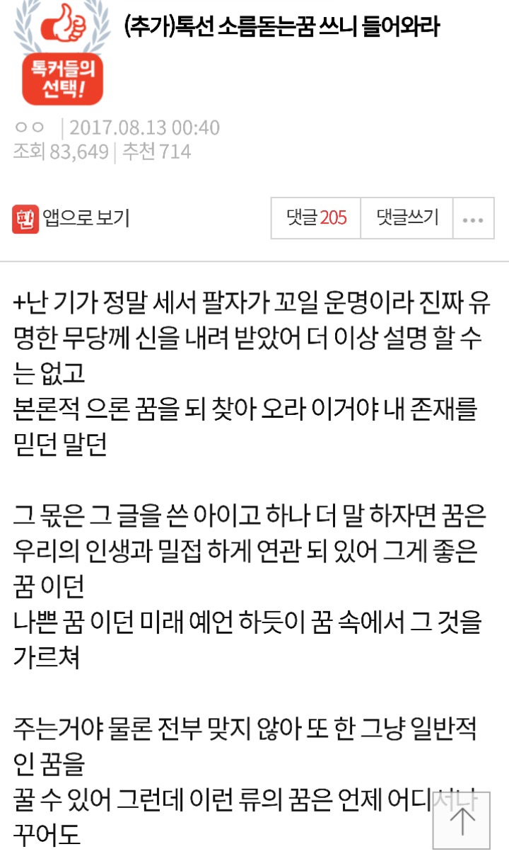 댓글 하나하나 읽어보는중인데 꿈이라는게 정말 신기한거같아 같이 꿈 얘기 풀어줘서 시간 가는줄 모르고 계속 판보고 있다ㅠㅠ 근데 진짜 많은 사람들이 소름돋다못해 살떨리는 꿈들을 꾼다.. 내 친구한테 링크 알려줘서 통화 켜놓고 같이 보고 있었는데 천만다행이라는 꿈도 있고 너무 슬프다는 꿈도 있고.. 친구 말 따라 더 이입돼서 읽힌다ㅠㅠ 그런꿈들 꾸느라 고생했어